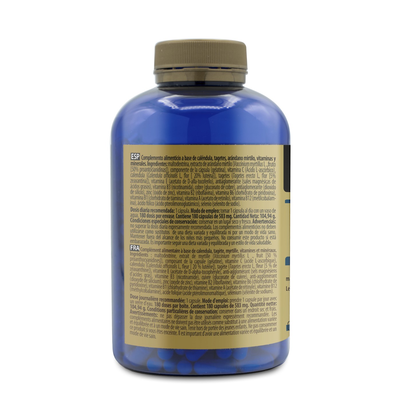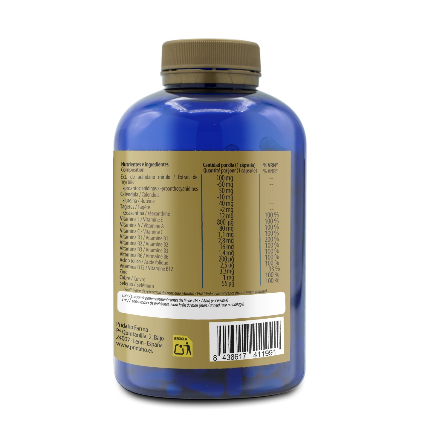 Maltodextrina, Extracto de arándano rojo (Vaccinium macrocarpon Aiton L, fruto [40:1 50% proantocianidinas]), Componente de la cápsula (Gelatina), Vitamina C (Ácido L-ascórbico), Calendula (Calendula Officinalis L., Flor [20% luteína]), Tagetes (Tagetes erecta L., flor [5% zeaxantina]) , Vitamina E (Acetato de D-alfa-tocoferilo), Antiaglomerante (Sales magnésicas de ácidos grasos), Vitamina B3 (Nicotinamida), Zinc (Óxido de Zinc), Cobre (Gluconato de cobre), Manganeso (Citrato de manganeso), Antiaglomerante (Dióxido de Silicio), Vitamina B2 (Riboflavina), Vitamina B6 (Clorhidrato de piridoxina), Vitamina B1 (Clorhidrato de tiamina), Vitamina A (Acetato de retinilo), Vitamina B12 (Metilcobalamina), Ácido fólico (Ácido pterolimonoglutámico), Selenio (Selenito de Sodio).