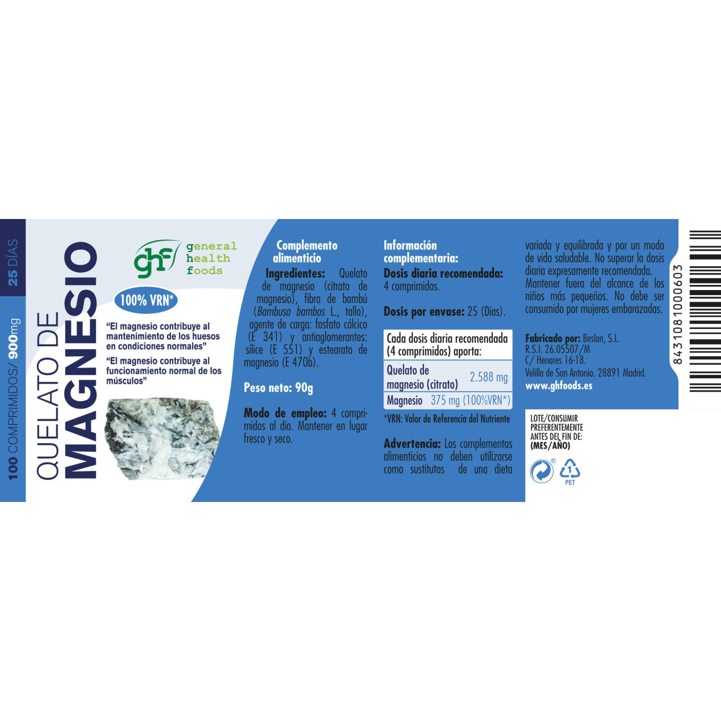 Quelato de magnesio (citrato de magnesio ), fibra de bambú (Bambusa bambos L tallo), agente de carga: fosfato cálcico (E341), antiaglomerantes sílice (E551) y estearato de magnesio (E470b).