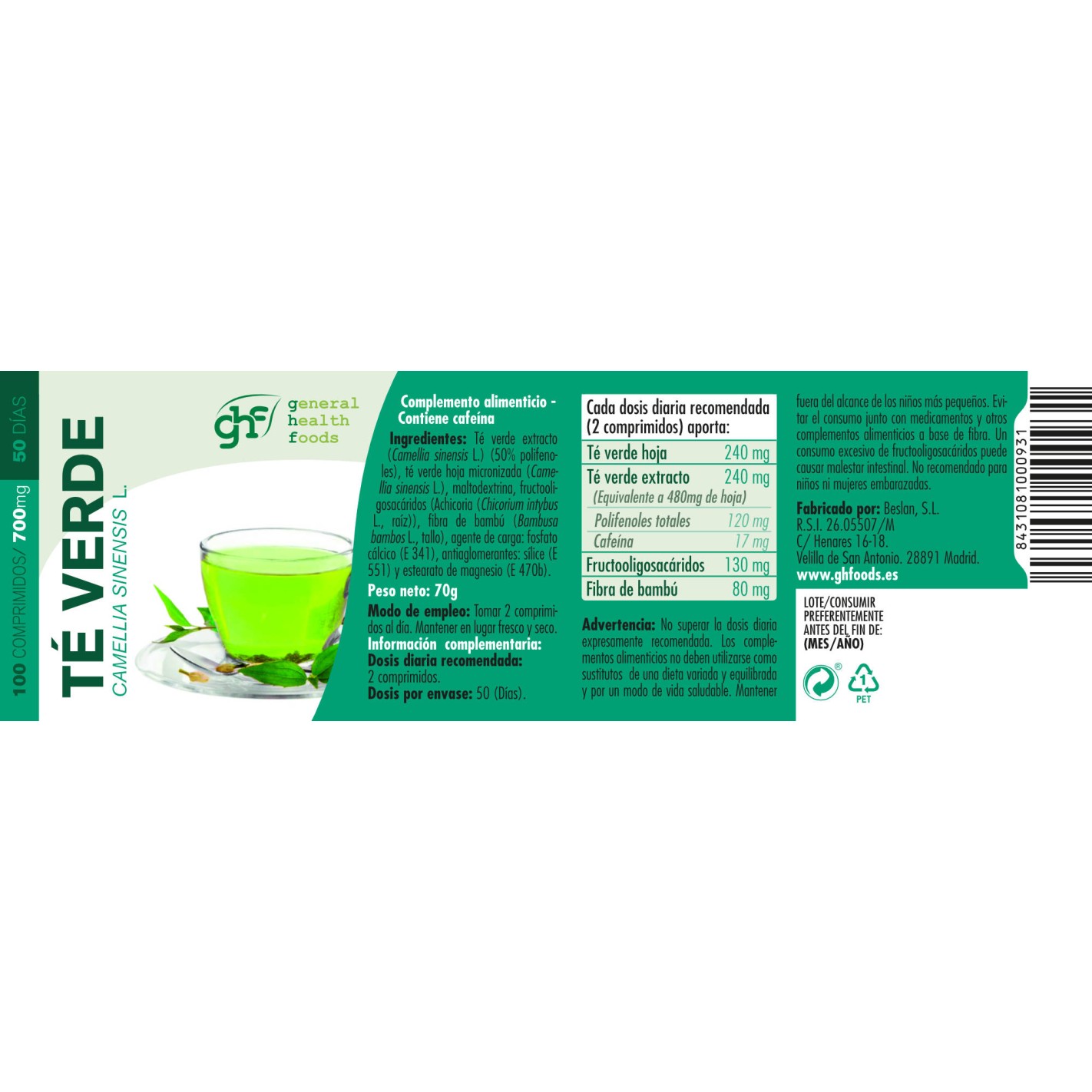 Composición: Comprimidos de 700mg, con 500mg de té verde (Camelia sinensis) hoja micronizada extracto, equivalente a 530mg de hoja. Fructooligosacáridos y celulosa microcristalina como excipientes.
