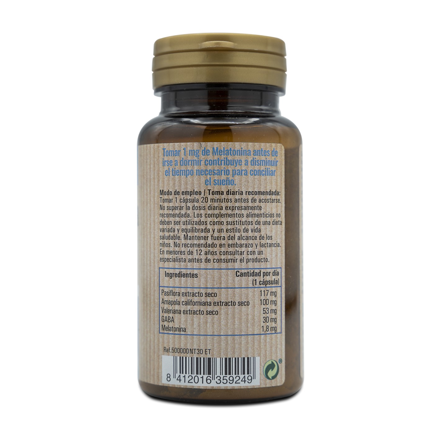Almidón de maíz (Almidón de maíz, Antiaglomerante [Celulosa]), Pasiflora extracto seco (Passiflora incarnata L., partes aéreas), Amapola californiana extracto seco (Valeriana officialis L., raíz), GABA (Acido gamma-amino butírico) Antiaglomerantes (Silicato magnésico, Sales magnésicas de ácidos grasos, Dióxido de silicio), Melatonina polvo.