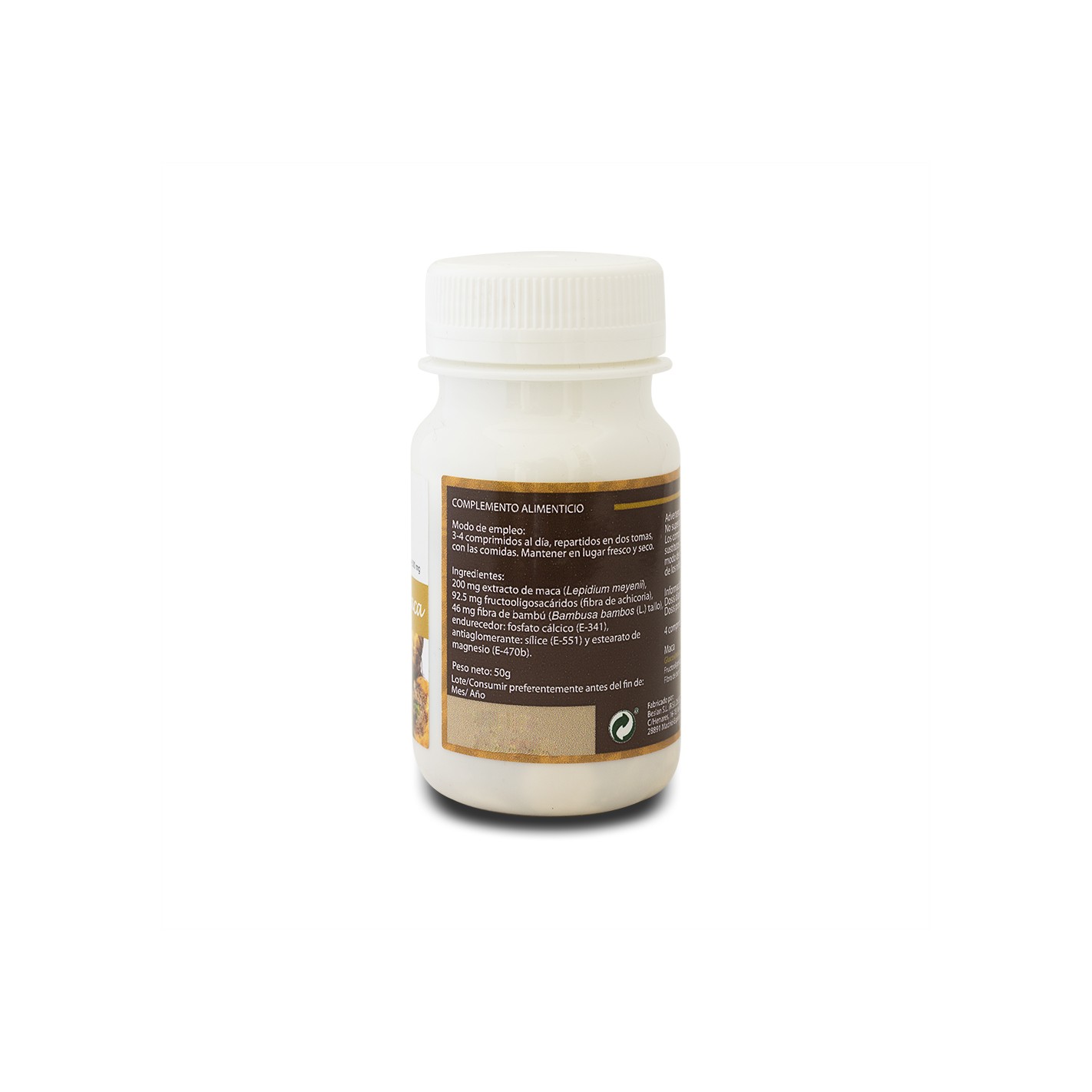 Maca en polvo (Lepidium meyenii, raíz), agente de carga: fosfato cálcico (E 341), maca extracto (Lepidium meyenii, extracto raíz), fructooligosacáridos (Achicoria (Cichorium intybus L., raíz)), fibra de bambú( Bambusa bambos L., tallo), antiaglomerantes: síiice (E 551) y estearato de magnesio (E 470b)