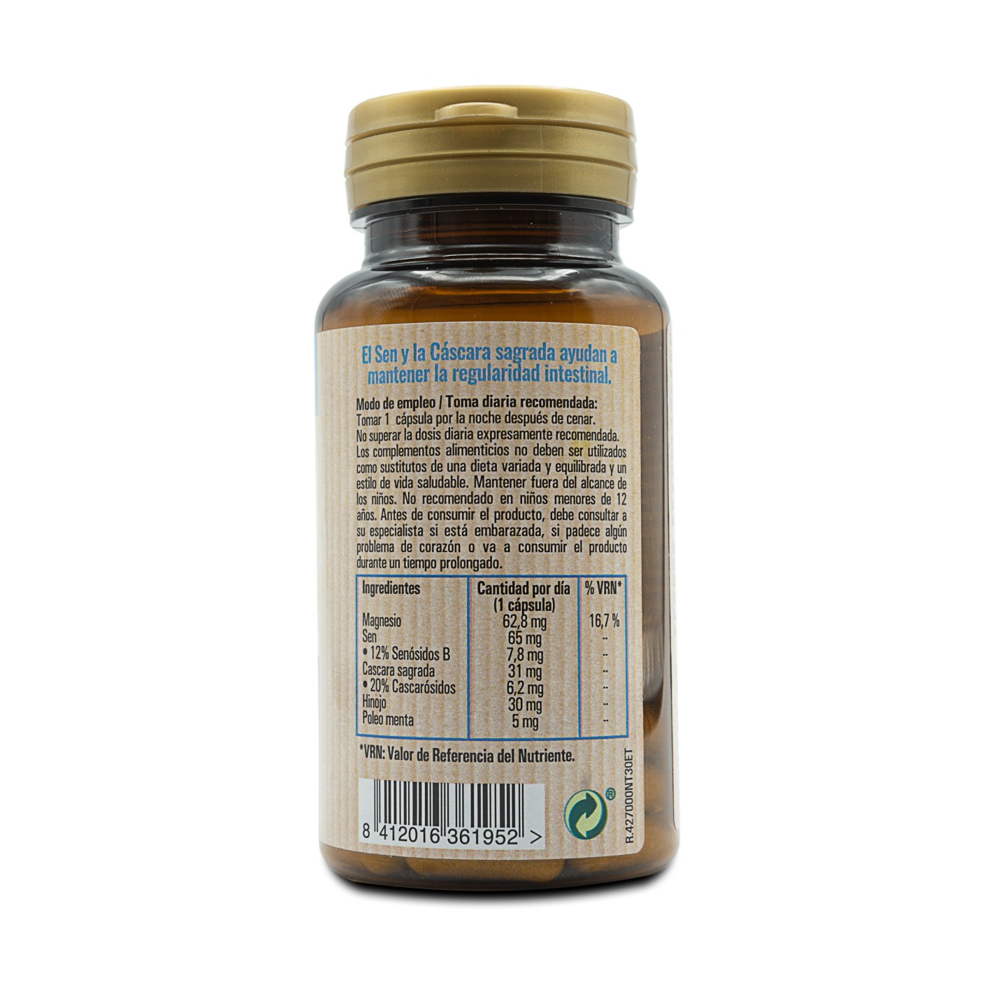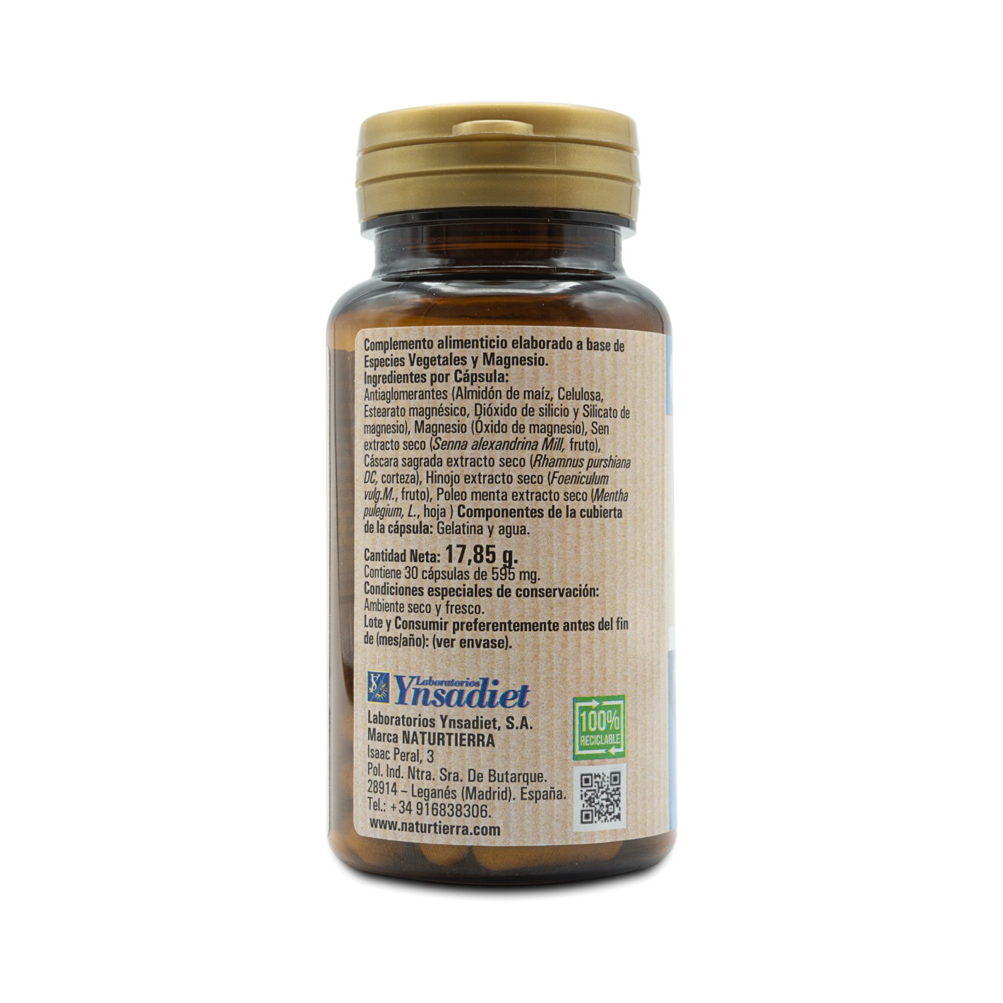 Almidón de maíz, Sen extracto seco (Senna alexandrina Mill, hoja), Magnesio (Oxido de magnesio), Componentes de la cubierta de la cápsula (Hidroxipropilmetilcelulosa), Agentes de carga (Celulosa, Silicato de magnesio, Sales magnésicas de ácidos grasos y Dióxido de silicio), Frángula extracto seco (Rhamnus frangula L., corteza), Hinojo extracto seco (Foeniculum vulgare, Mill, fruto).