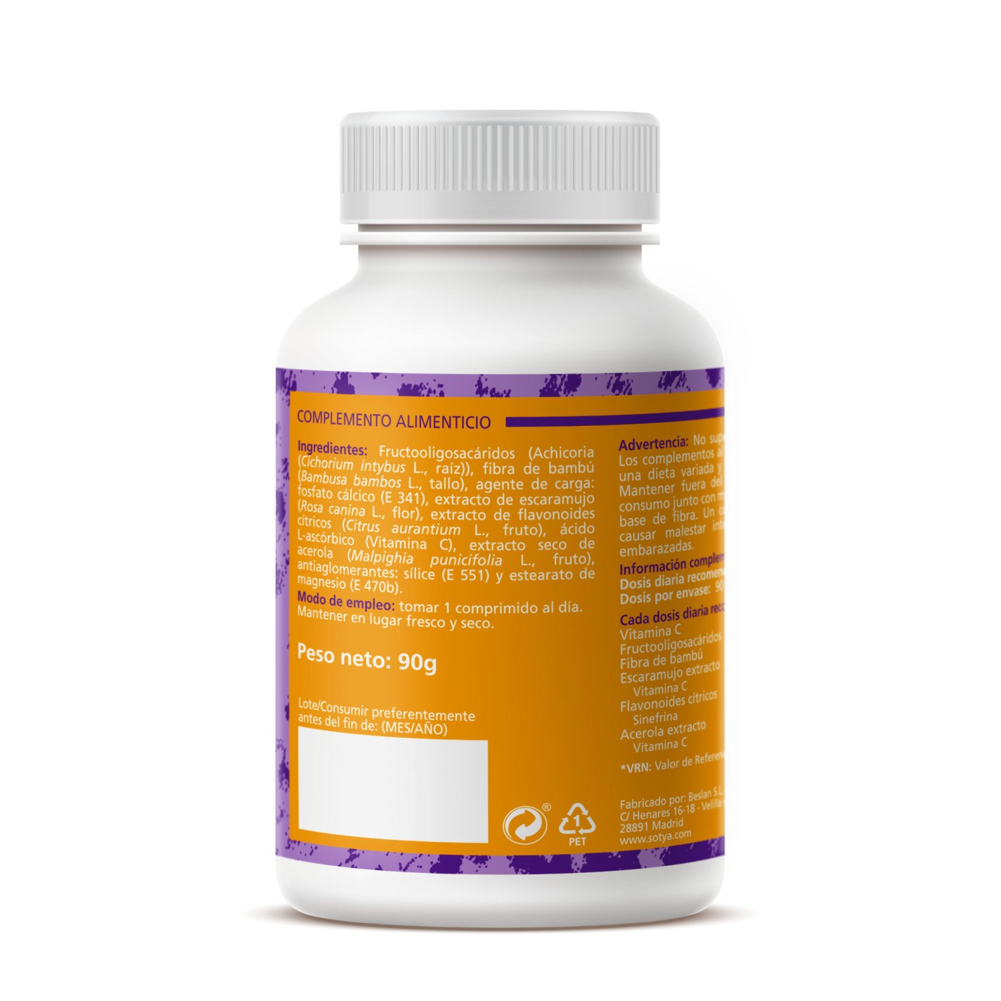 Extracto de flavonoides cítricos (Citrus aurantium L., fruto), agente de carga; fosfato cálcico (E 341), fibra de bambú (Bambusa bambos L., tallos), extracto de escaramujo (Rosa canina L., flor), ácido L-Ascórbico (vitamina C), extracto seco de acerola (Malpighia punicifolia L., fruto), antiaglomerantes: silice (E 551) y estearato de magnesio (E 470b).