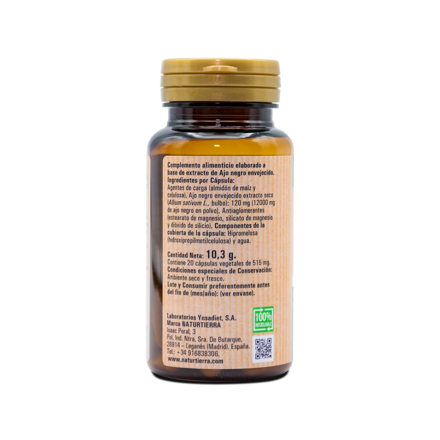 Agentes de carga (almidón de maíz y celulosa), Ajo negro envejecido extracto seco (Allium sativum L., bulbo): 120 mg (12000 mg de ajo negro en polvo), Antiaglomerantes (estearato de magnesio, silicato de magnesio y dióxido de silicio).