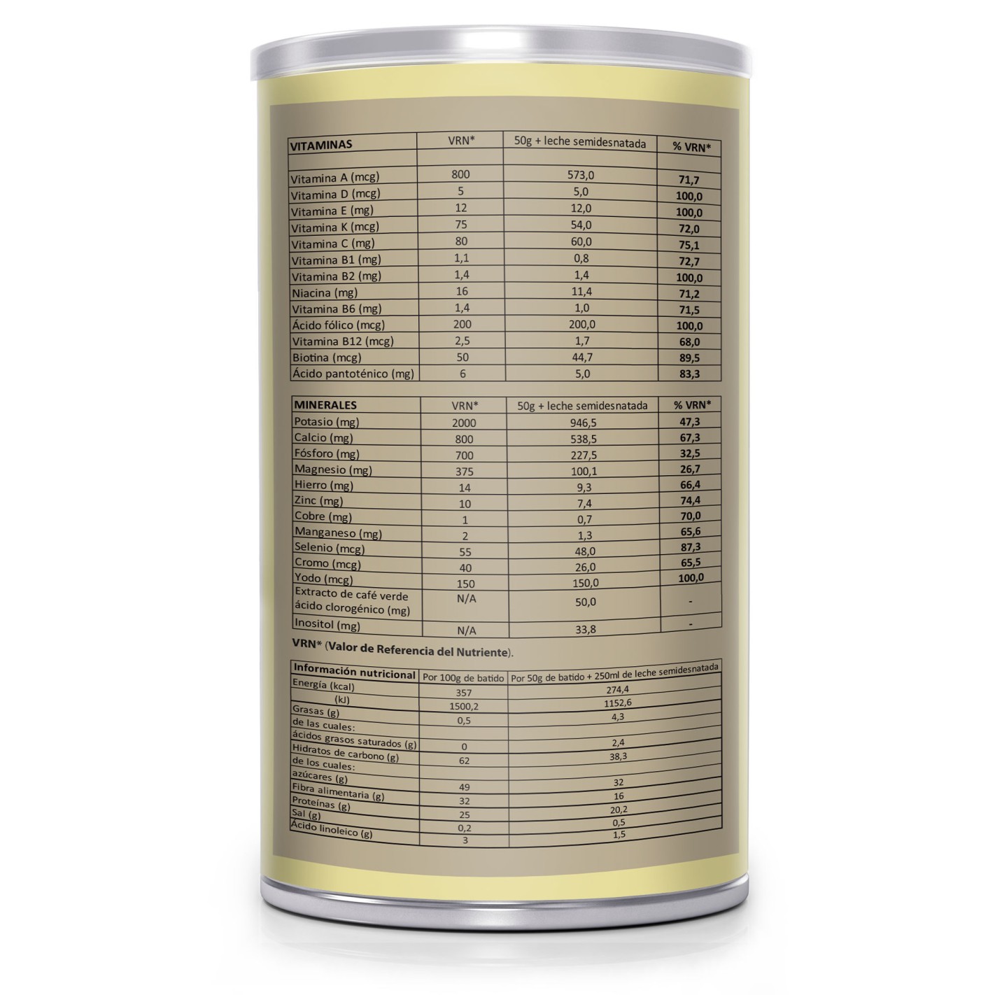 Fructooligosacáridos (fibra de achicoria), maltodextrina, fibra de bambú(Bambusa bambos (L) Voss, tallo), espesante:goma xantana (E 415), carbonato de magnesio, citrato potásico, extracto de Café verde(Coffea arábica L., grano), gluconato de hierro, ácido L-ascórbico(vitamina C), gluconato de zinc, nicotinamida (vitamina B3), D- pantotenato cálcico(Vitamina B5), colina bitartrato,inositol, gluconato de cobre, gluconato de manganeso, yoduro potásico, picolinato de cromo, acetato de D-alfa- tocoferilo (vitamina E), piridoxina clorhidrato (vitamina B6), riboflavina ( vitamina B2), tiamina clorhidrato (vitamina B1), acetato de retinilo(vitamina A), selenito sódico, ácido pteroilglutáminico (ácido fólico), filoquinona (vitamina K), D-biotina, cianocobalamina (vitamina B 12), colecalciferol(vitamina D3). Edulcorante: sucralosa (E955), colorante : betacaroteno (E160). Aroma natural de chocolate blanco.