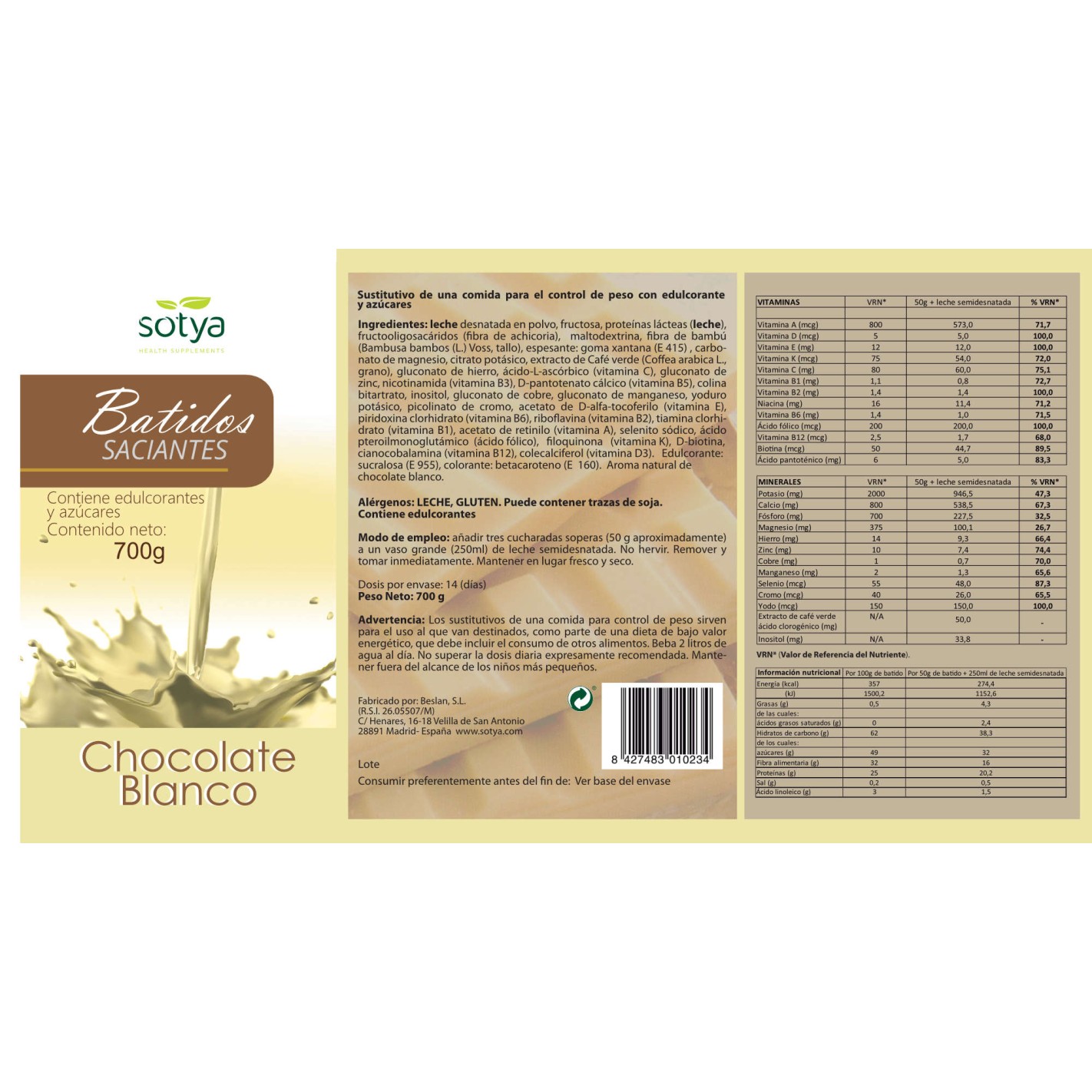 SOTYA Batido sabor chocolate blanco 700 gr