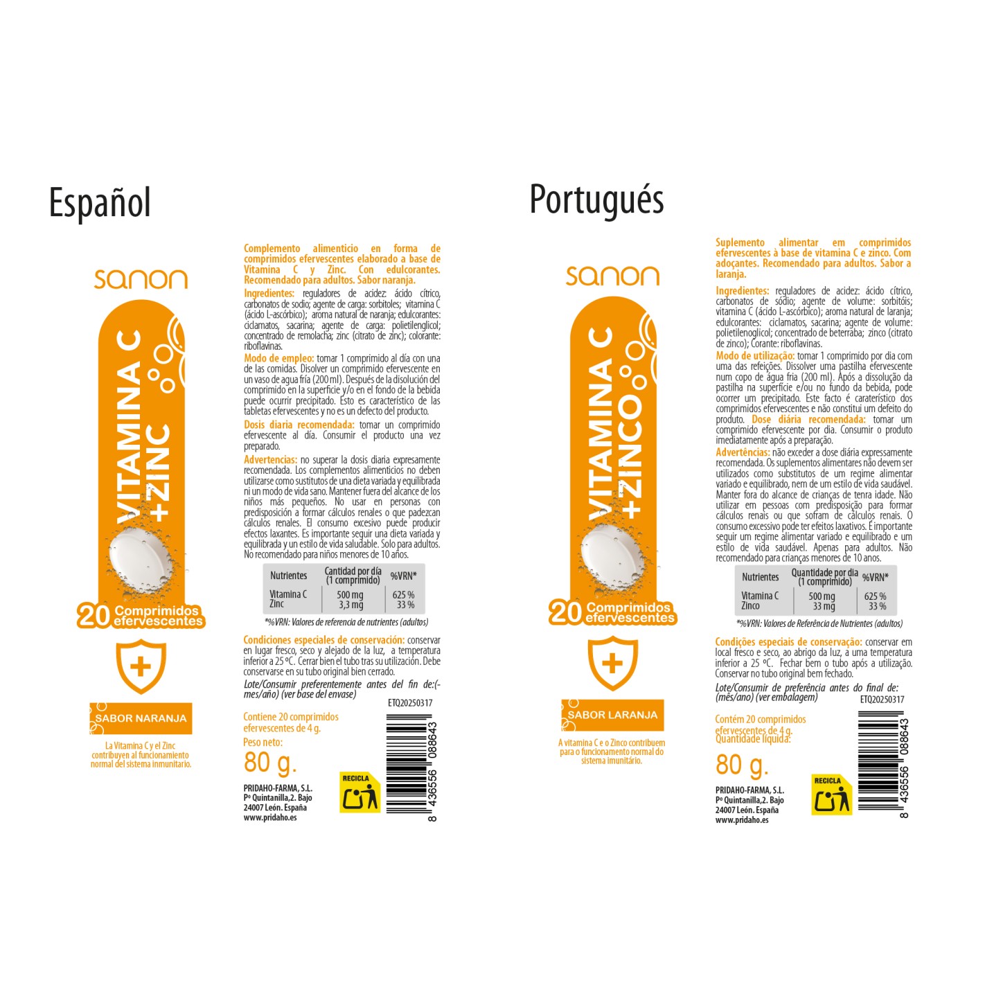 Complemento alimenticio en forma de comprimidos efervescentes elaborado a base de vitamina C y Zinc. Con edulcorantes.